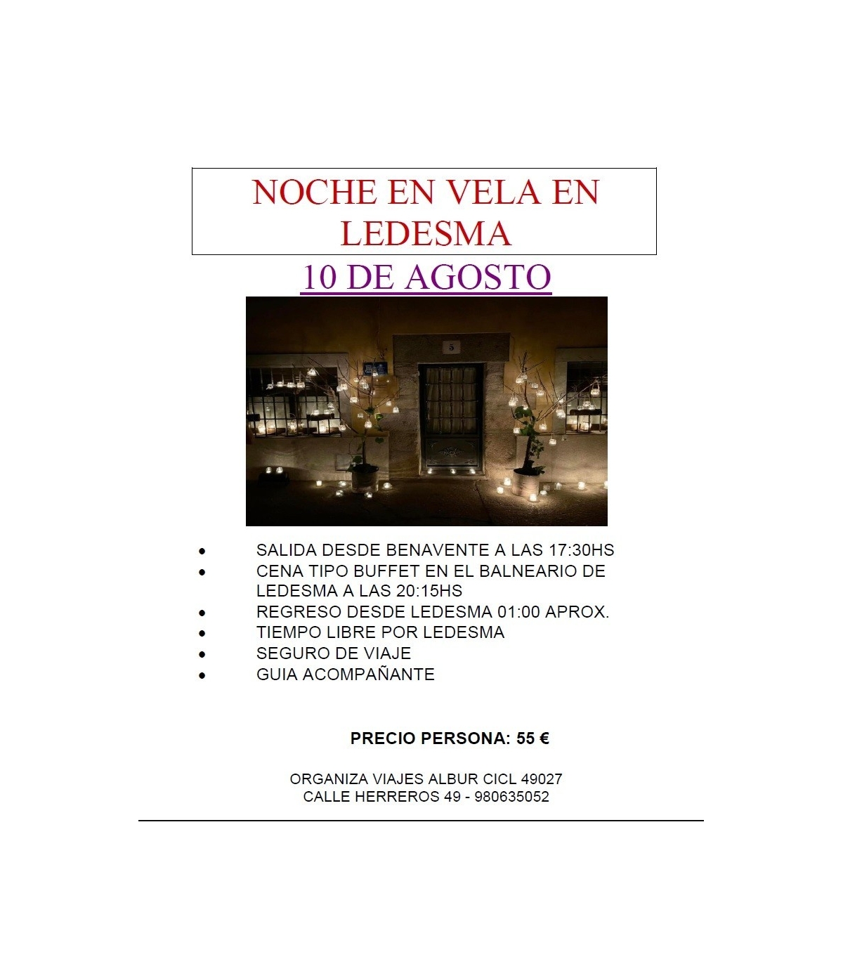 Proponemos visitar Ledesma en la noche que con velas y actuaciones en la calle van a mostrar los encantos de esa villa. Recordad, el 10 de agosto desde Benavente con nosotros, Viajes Albur