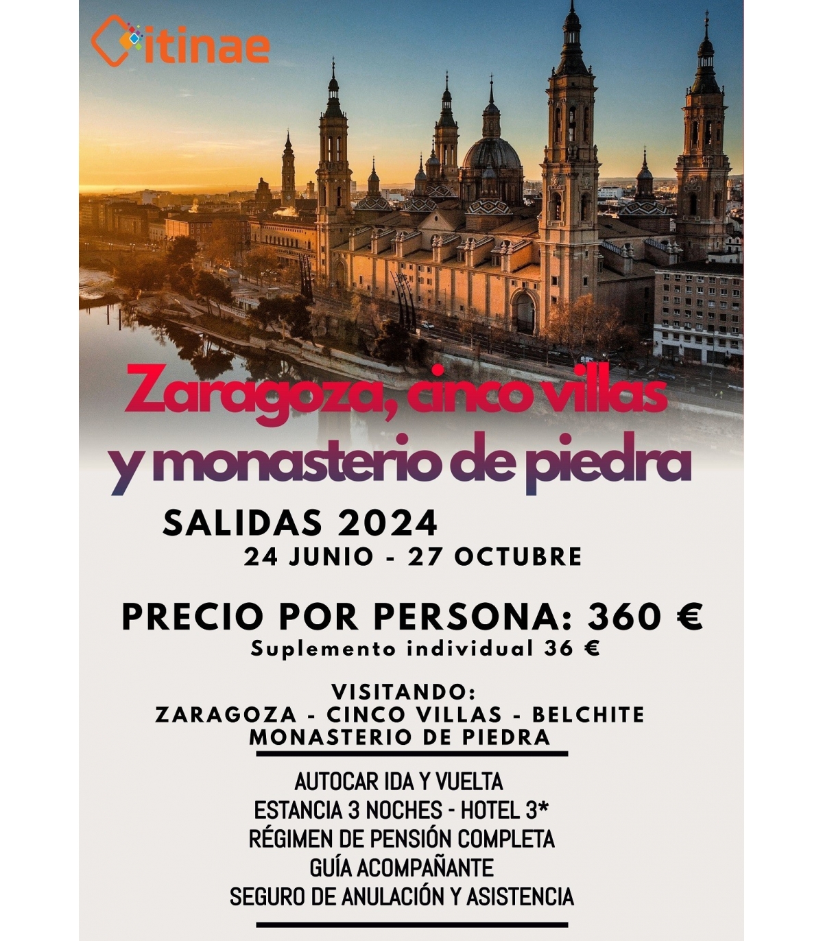 Zaragoza, las Cinco Villas y el Monasterio de Piedra en un circuito de 4 días con salida desde Madrid. Salidas Especiales el 30/06 y el 01/11.