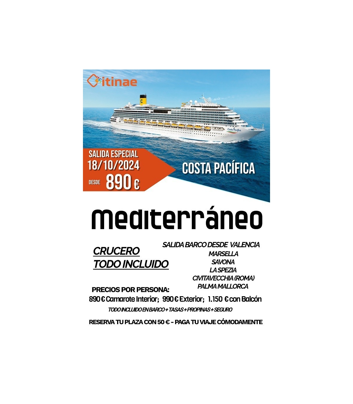 - 7 noches en Barco Costa Pacífica con salida desde Valencia.